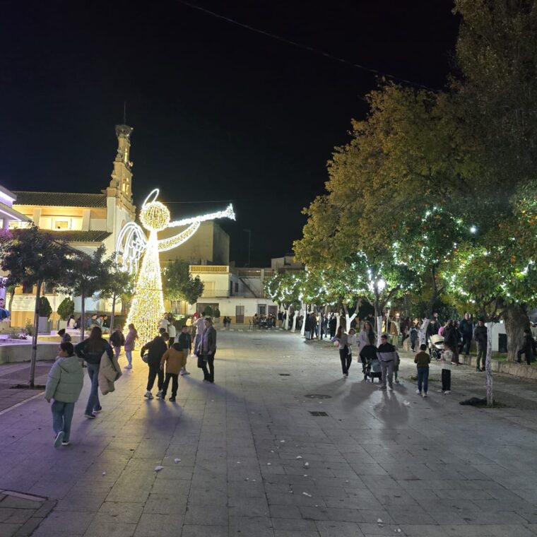 Zambomba navideña con el grupo flamenco jerezano de Paqui Lorda, encendido de las luces navideñas, inauguración del Belén de la Plaza elaborado voluntariamente por Antonio García «Cata» , nieve artificial para los más peques y todo acompañado de una buena candela, anís, buñuelos de nuestra Adelina y chocolate calentito elaborado por Vicente Vargas.